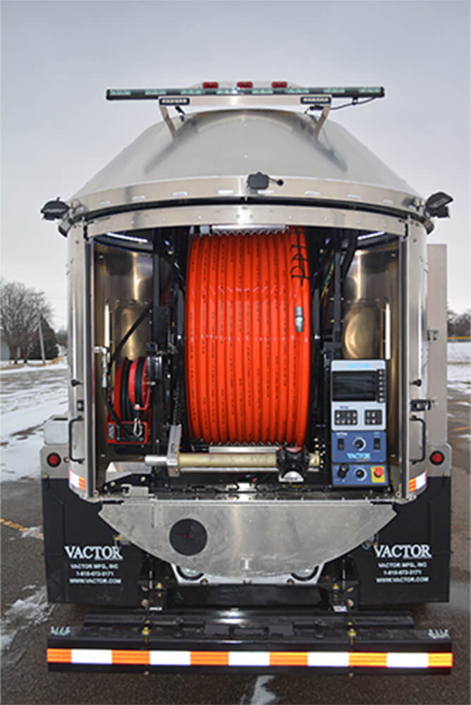 • Rear hose reel rotates a total of 180 degrees, 90 degrees to curb side, 90 degrees to street side